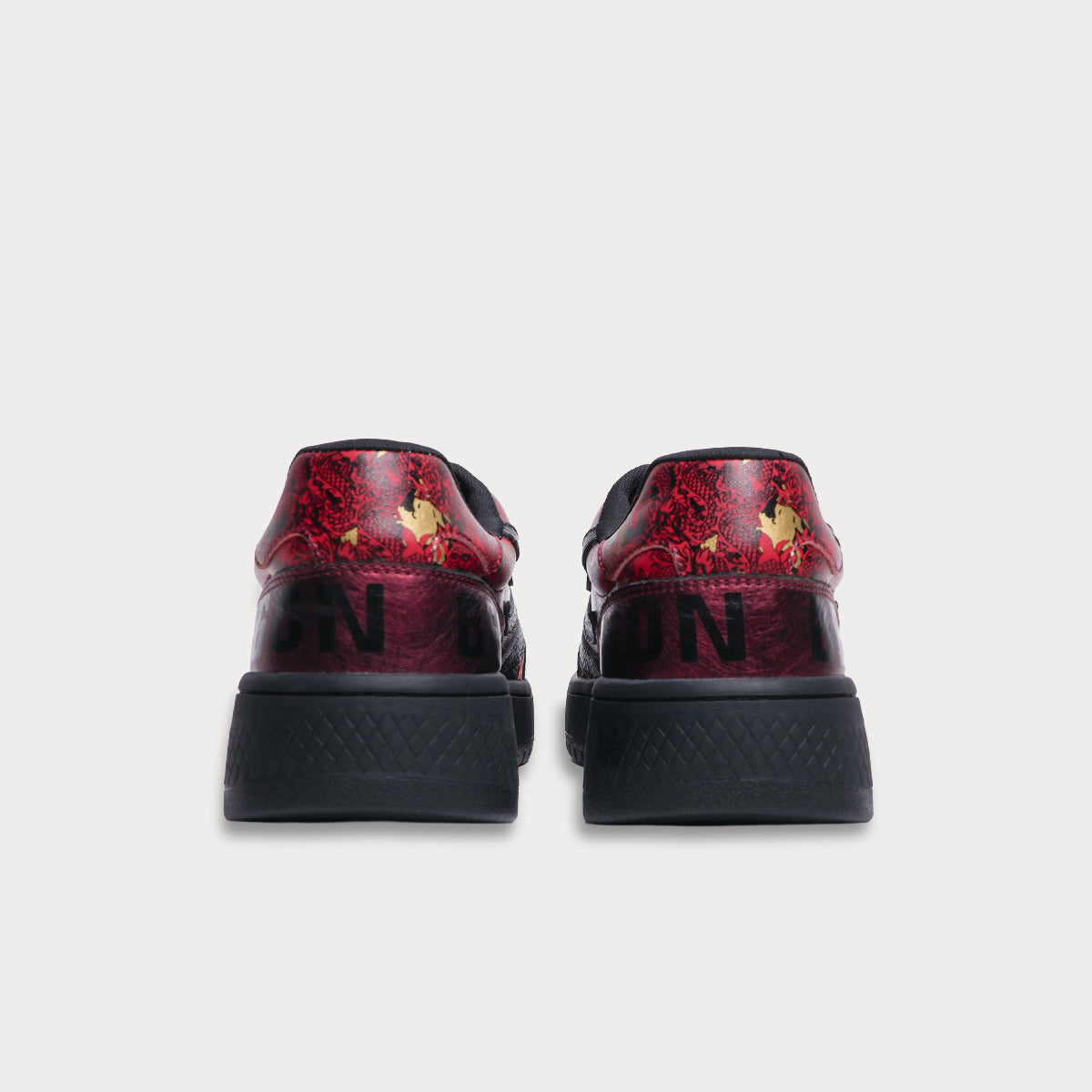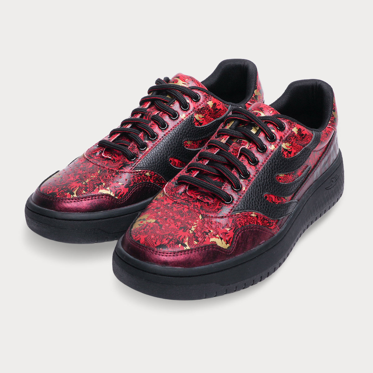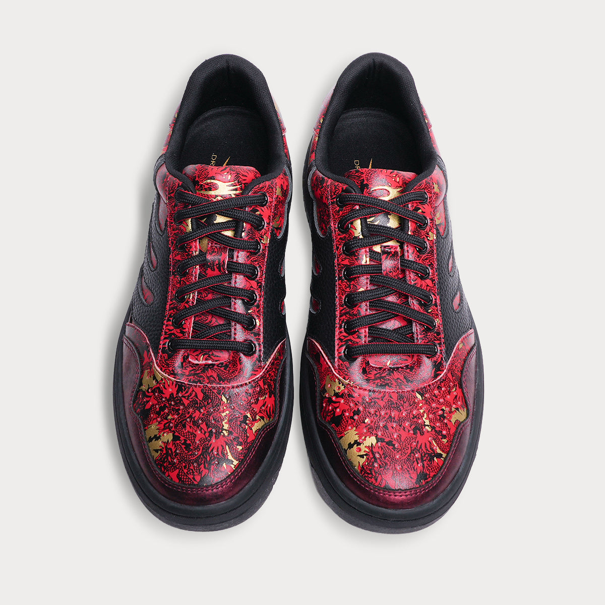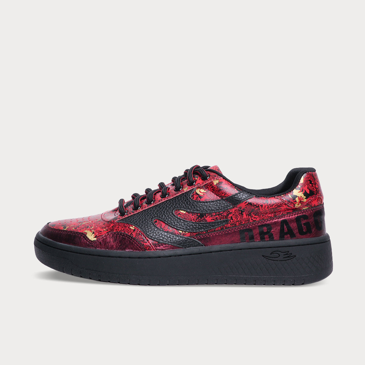 アッパー全体に描かれた緻密な龍のデザインが、まるで一足の中に炎が宿っているかのようなダイナミズムを表現しています。