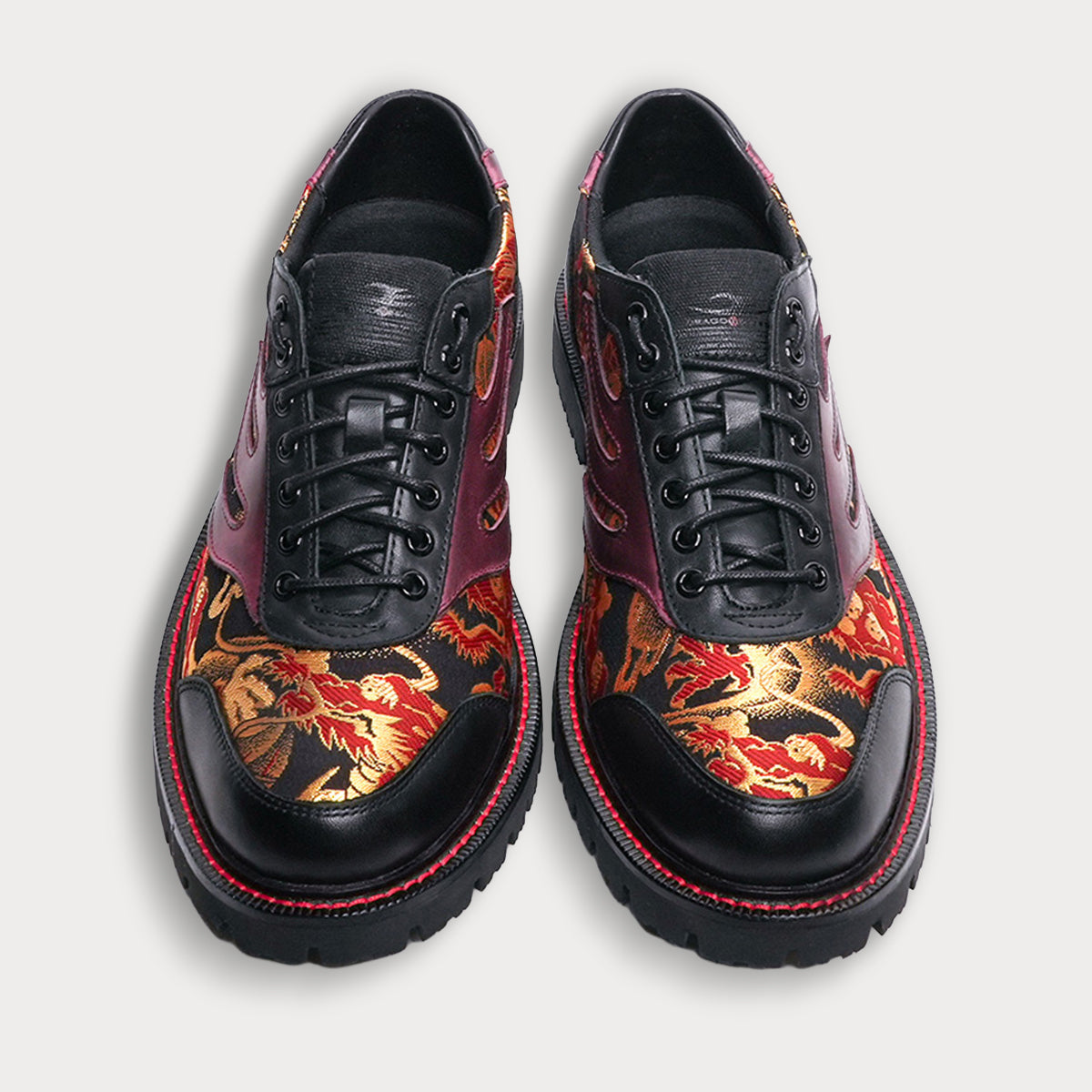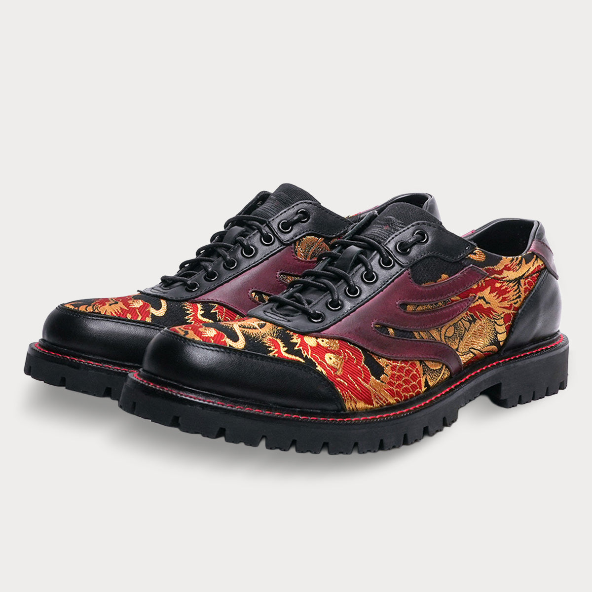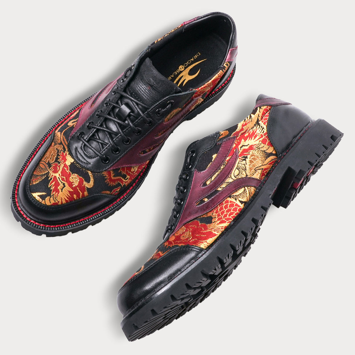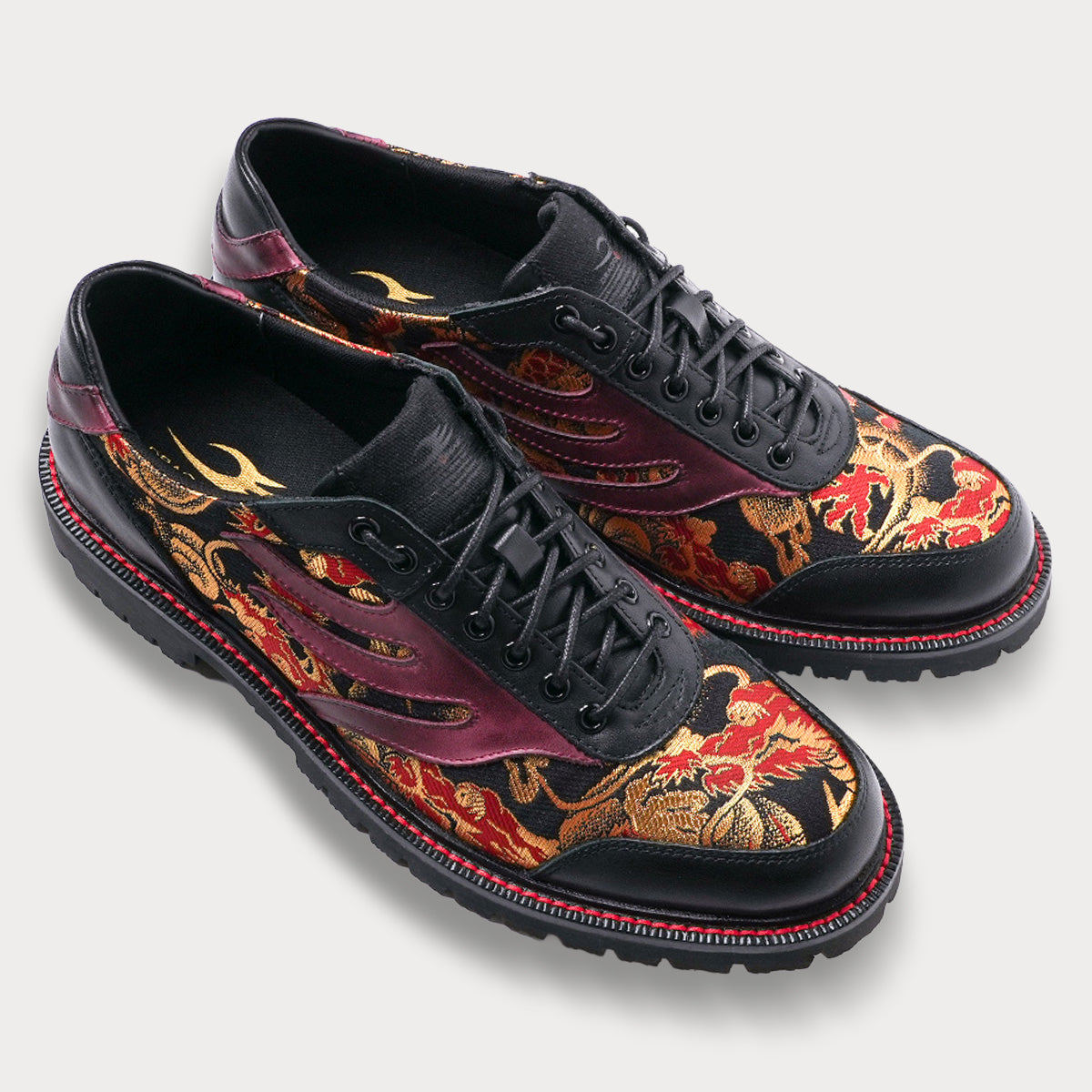 アッパーには上質なカーフレザーを使用。黒×赤の配色が映えるよう、アウトソールのウェルトには黒革をベースに太めの赤ステッチを施し、燃え上がるような“火龍”をイメージ。日本の伝統とアヴァンギャルドなスタイルが絶妙に融合したデザインです。