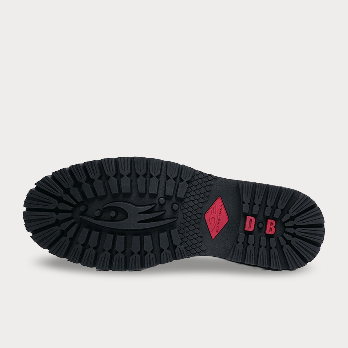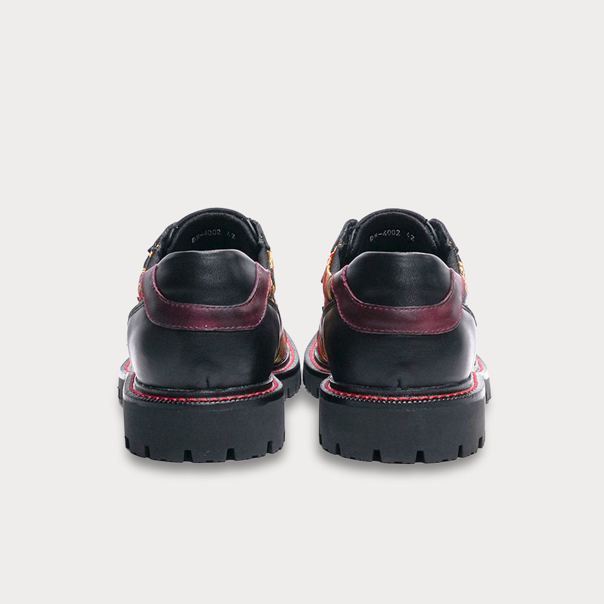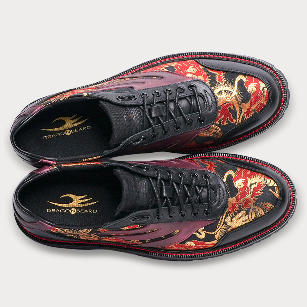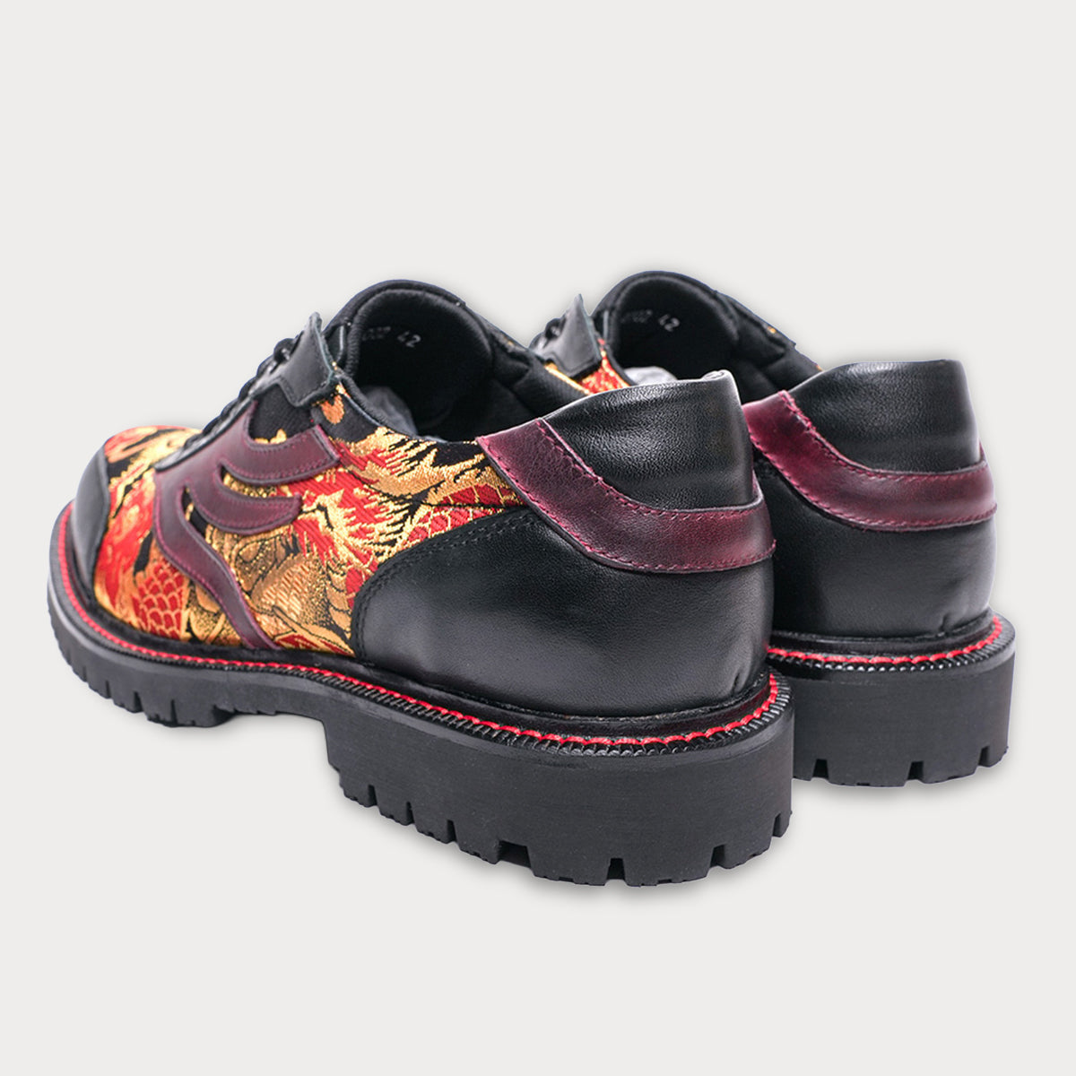 アッパーには上質なカーフレザーを使用。黒×赤の配色が映えるよう、アウトソールのウェルトには黒革をベースに太めの赤ステッチを施し、燃え上がるような“火龍”をイメージ。日本の伝統とアヴァンギャルドなスタイルが絶妙に融合したデザインです。