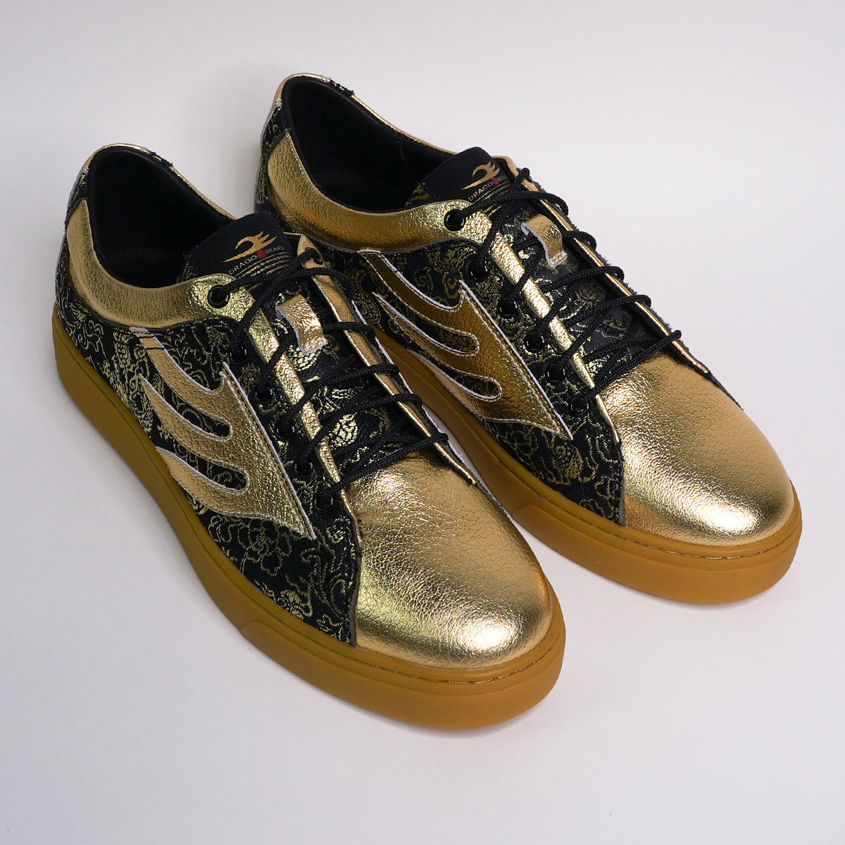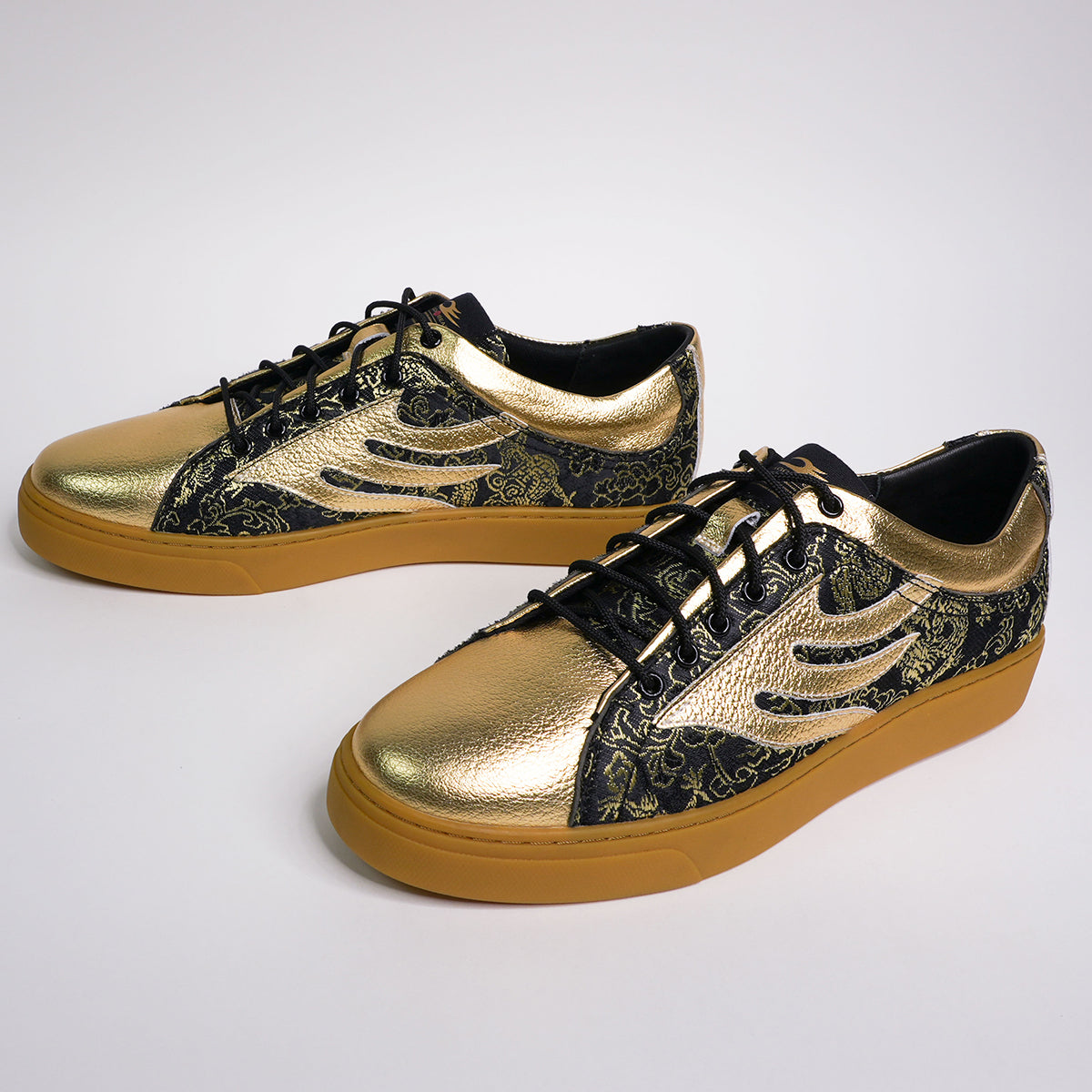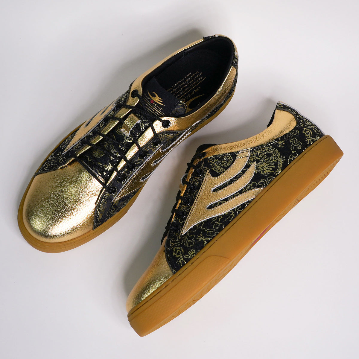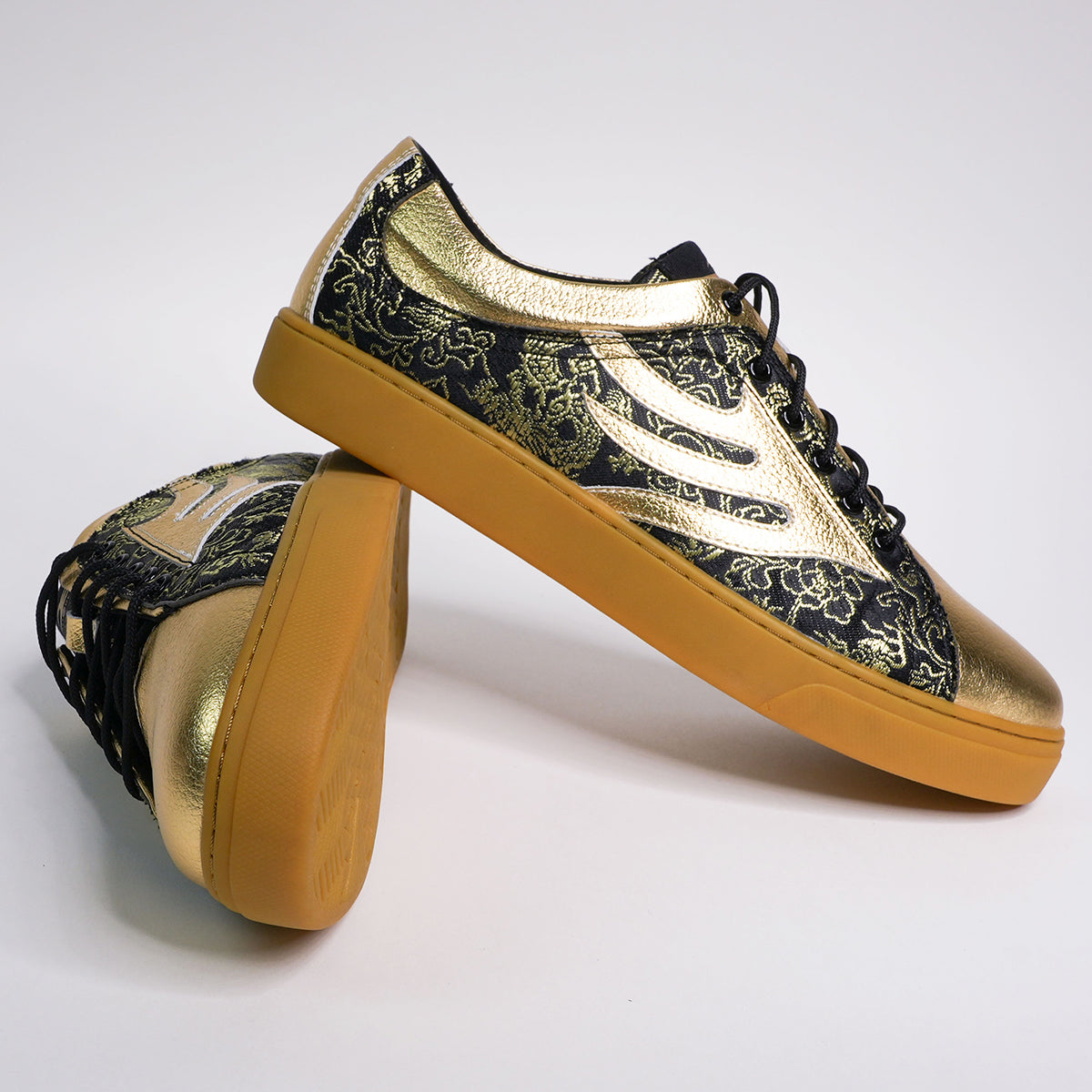 カジュアルな外羽根デザインに、つま先からアイレットステイ、そしてアッパーには高級感漂う和柄生地を採用し、さらに目を引くゴールドレザーを組み合わせることで、唯一無二のラグジュアリーなデザインに仕上げました。