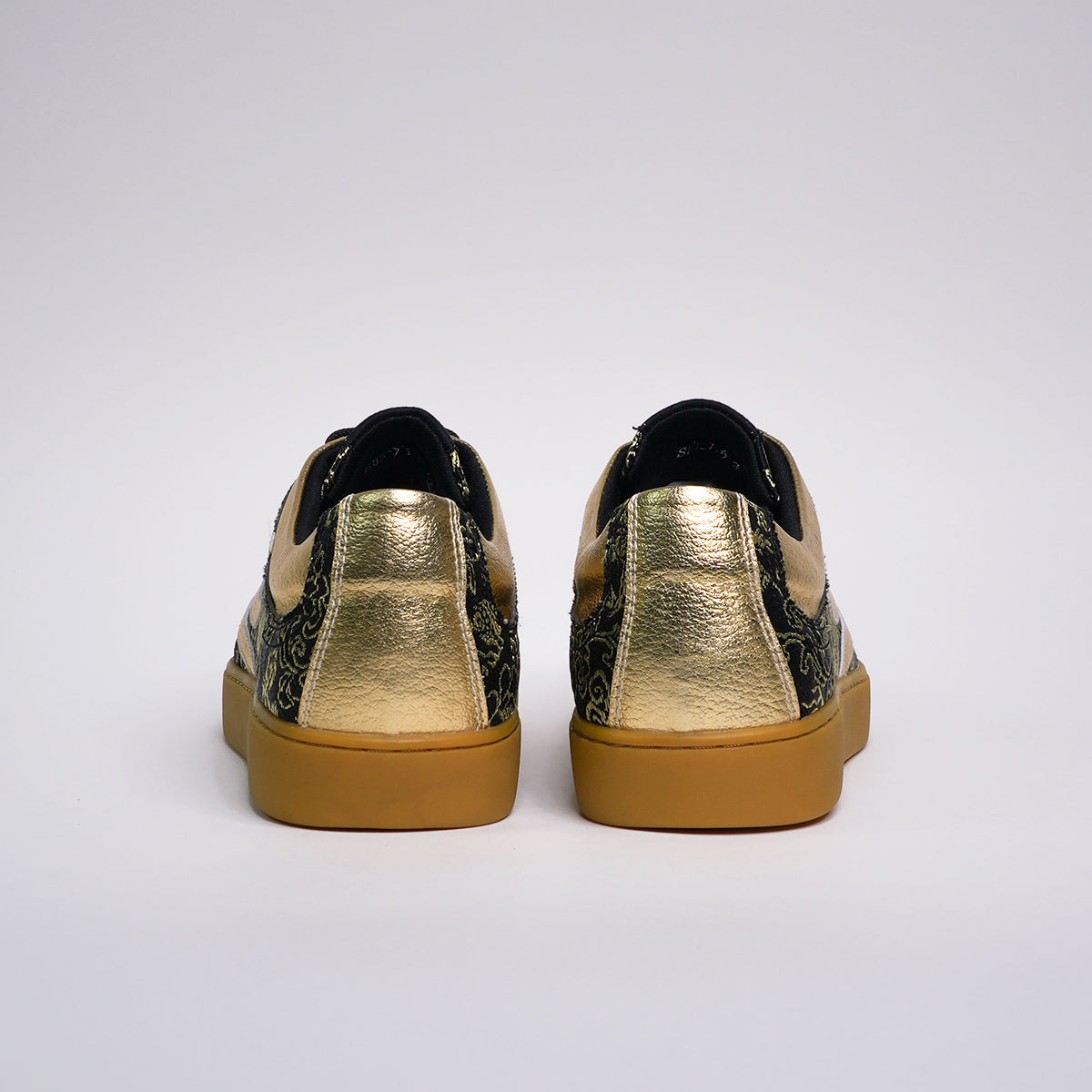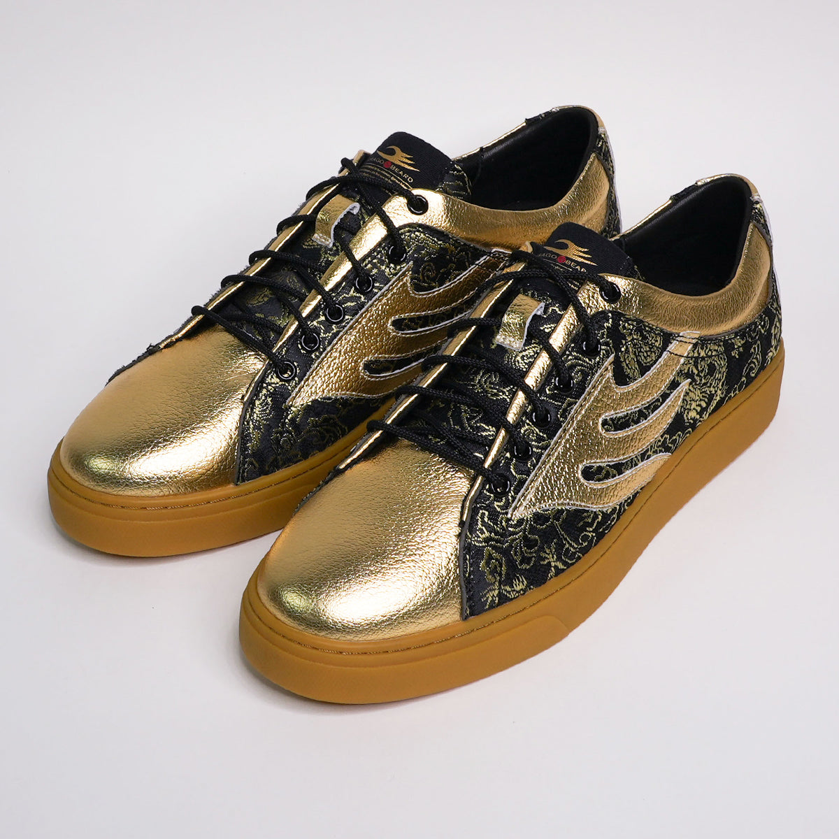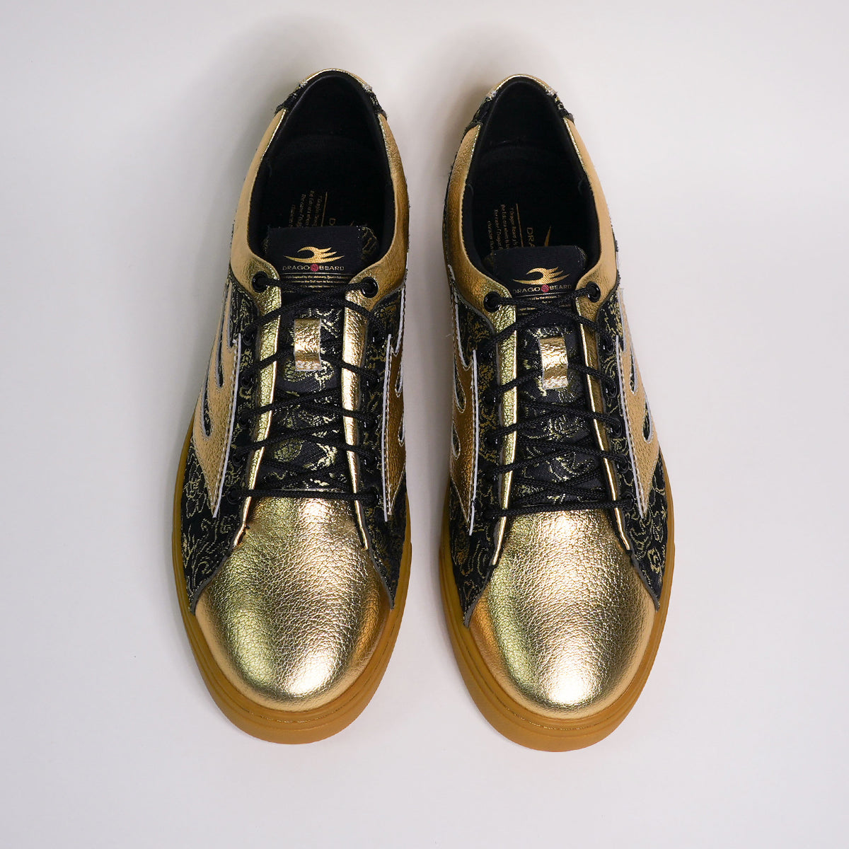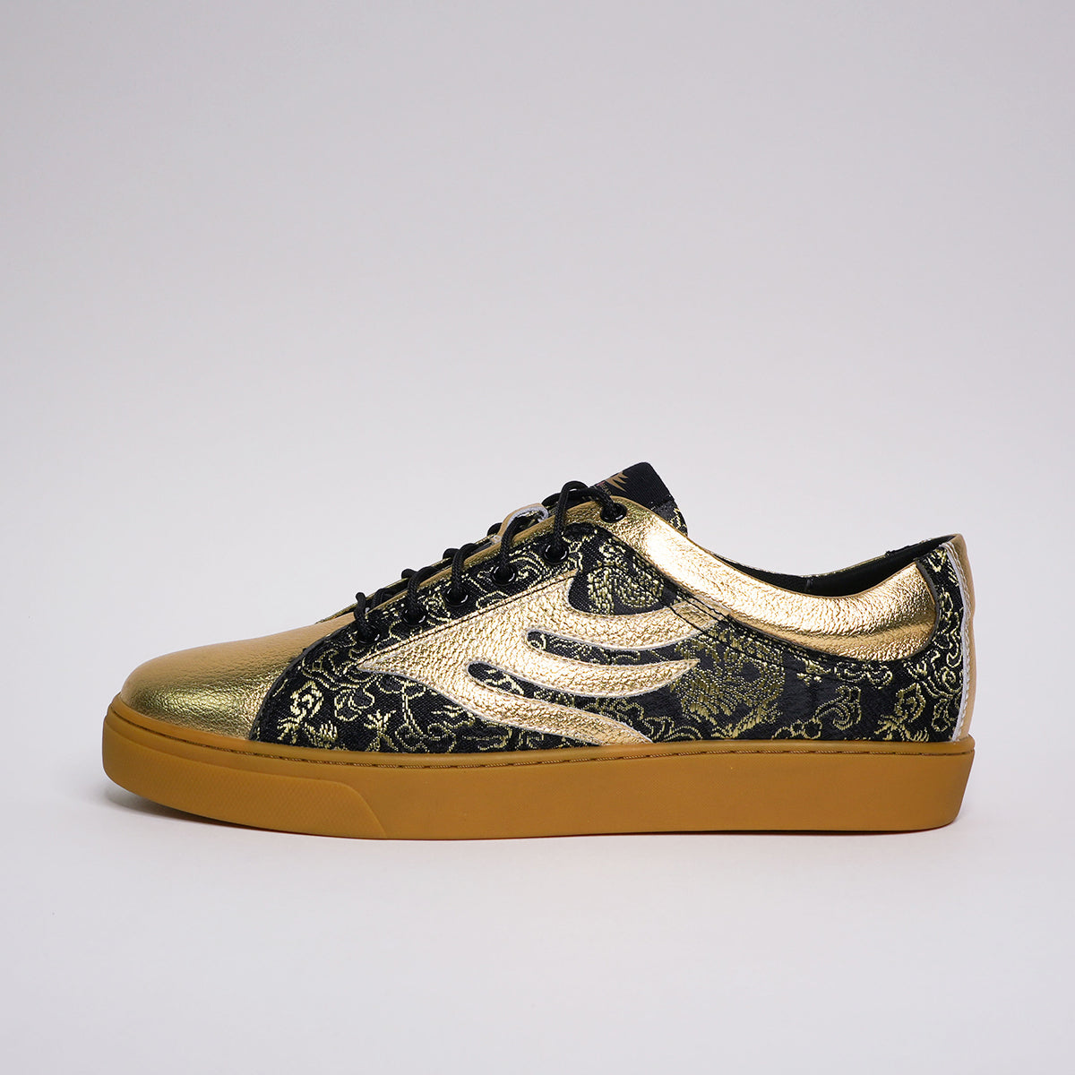 カジュアルな外羽根デザインに、つま先からアイレットステイ、そしてアッパーには高級感漂う和柄生地を採用し、さらに目を引くゴールドレザーを組み合わせることで、唯一無二のラグジュアリーなデザインに仕上げました。