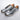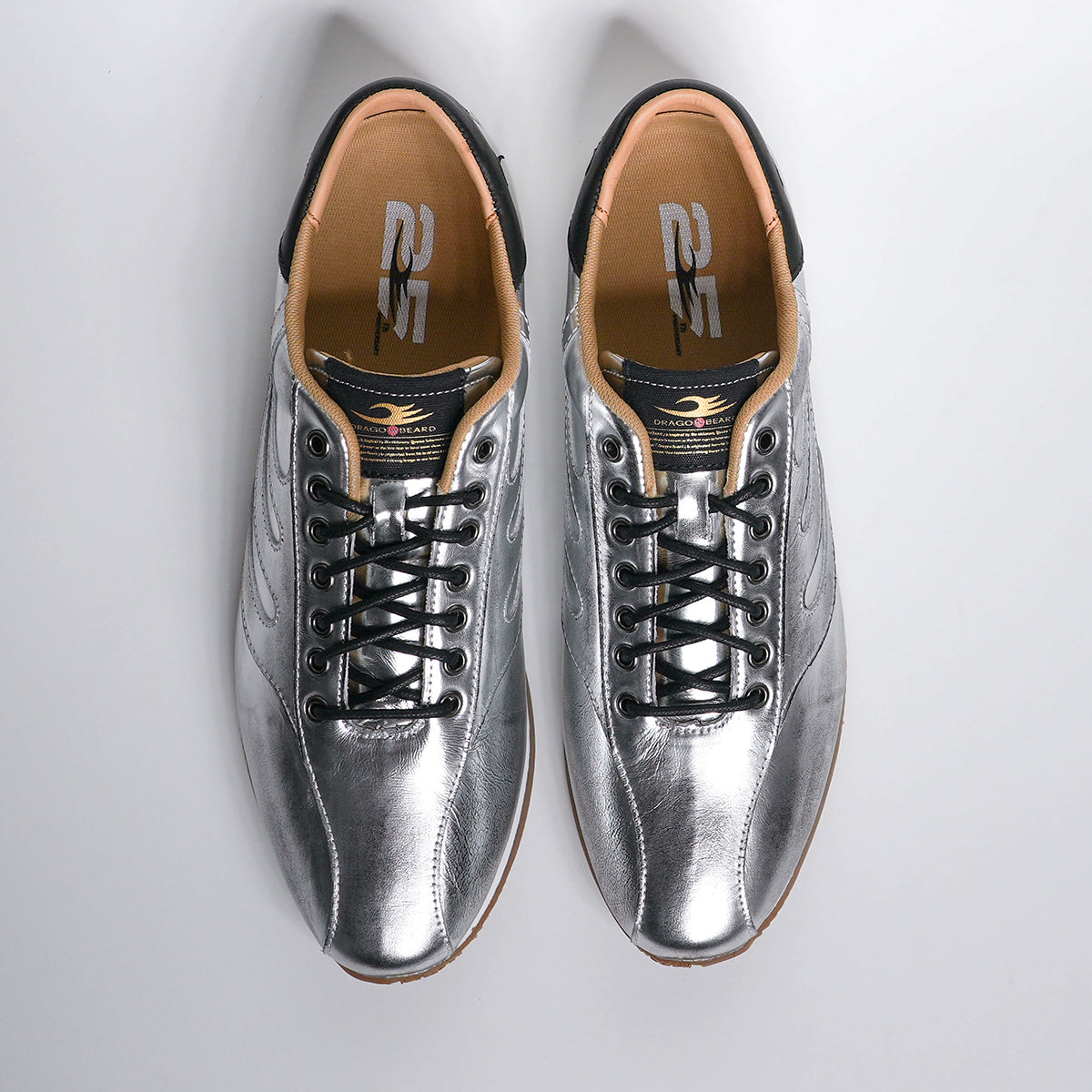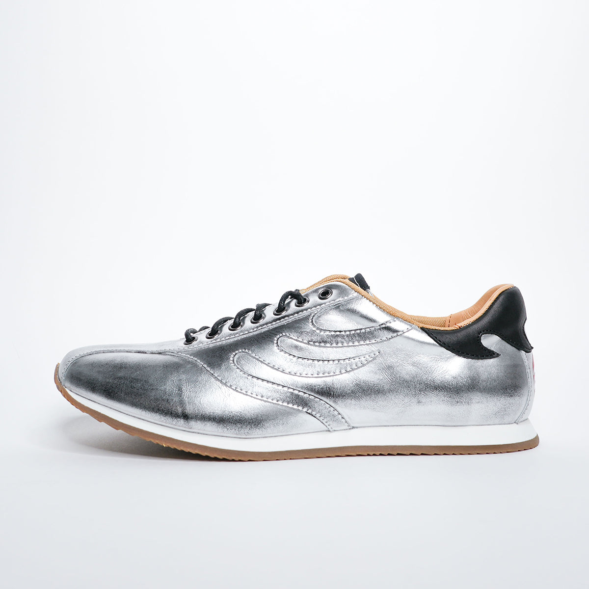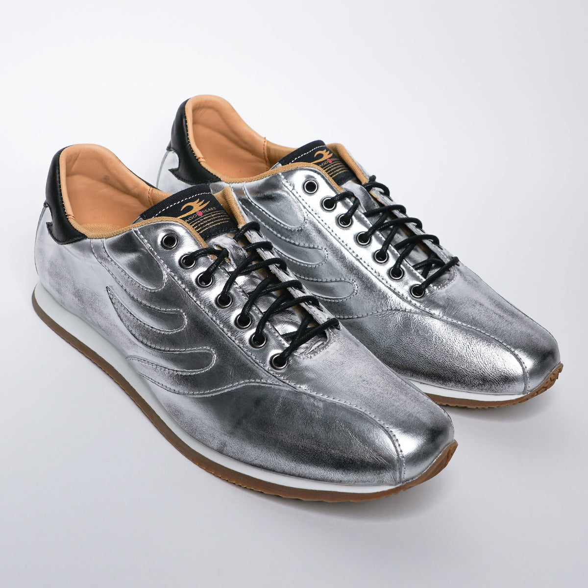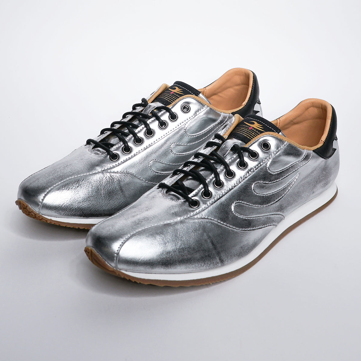 アッパーには、インパクト抜群のメタリックシルバーのレザーを採用。特殊加工により